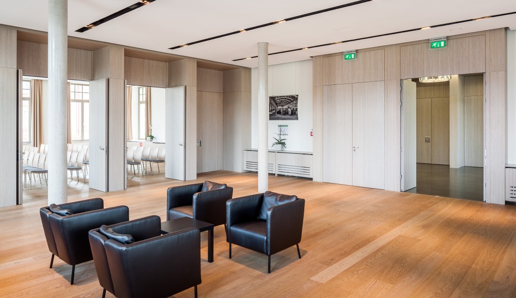 Nebeneinander liegende Türöffnungen ermöglichen eine großzügige Verbindung der Veranstaltungssäle. Die einzelnen Räume lassen sich so, je nach Größe und Konzept der Veranstaltung, über ihre gesamte Breite zu einer Raumfolge zusammenschalten. Auch Buffet und Ausschank können je nach Bedarf zum Theater- oder zum Mehrzwecksaal hin geöffnet werden.