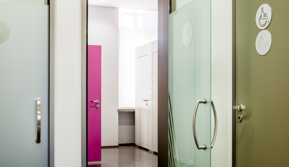 Die durchgängig neuen Türelemente, sowohl in der Gebäudehülle als auch im Innenausbau, erfüllen unterstützen vor allem das Konzept der flexibel nutzbaren Räume.