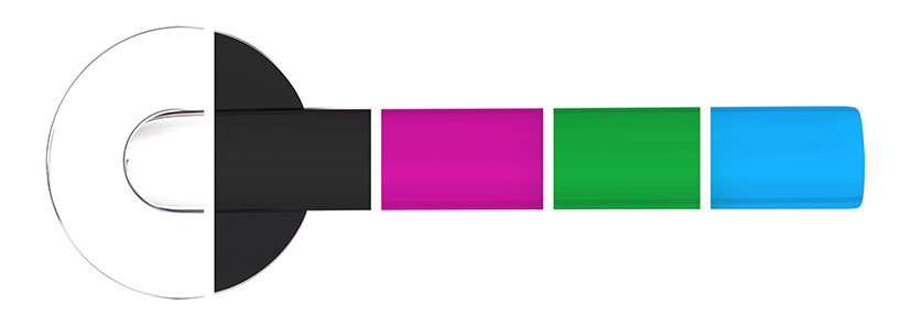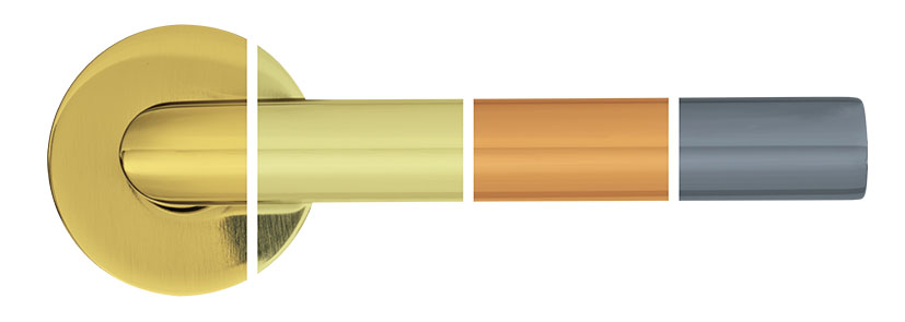 Die PVD-beschichteten Drücker sind auf Anfrage in individuellen Farbgebungen von chromfarben, edelstahlfarben über messingfarben bis hin zu kobaltblau erhältlich.